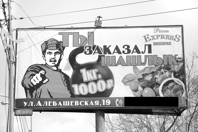 Видимо, так же экстренно, но уже из коммерческой необходимости, рождаются и рекламные плакаты с красноармейцем. Призывать к защите отечества ему уже не надо, а вот купить, например, шашлык – самое время. Так, видимо, считают специалисты компании «Мир», которая предложила использовать широко известный символ для рекламы сети ресторанов быстрого питания «Пицца-экспресс». Ничего особенного в попытке сочетать несочетаемое заказчики не увидели.