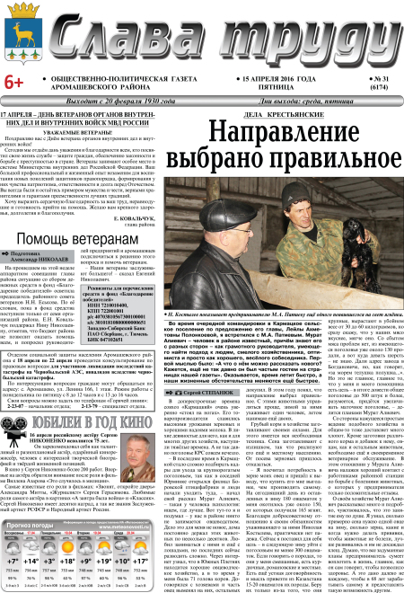 Уважаемые читатели! Предлагаем вам электронную версию газеты «Слава труду» № 31 от 15.04.2016 г. в формате PDF.