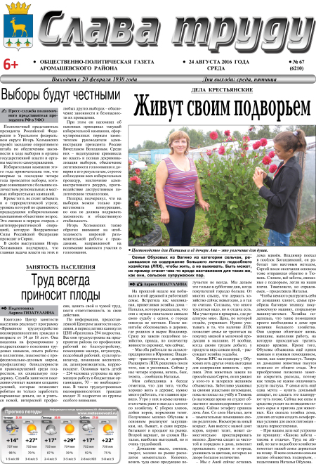 PDF-версия газеты «Слава труду» № 67 (6210) от 24.08.2016 г.