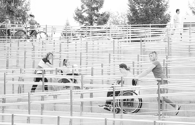 Испытывали трудности и пациенты центра по лечению спортивных травм. Зато теперь мы получили не один пандус, а систему пандусов, оборудованных удобными двусторонними перилами и просторными площадками для разворота коляски. Позаботились и о людях со слабым зрением: закругленные концы перил обозначены яркой лентой с нанесенными на нее надписями тактильным шрифтом Брайля.