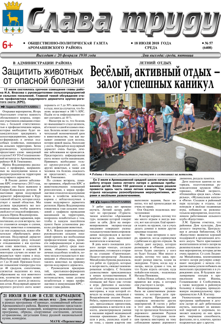 Уважаемые читатели! Предлагаем вам электронную версию газеты «Слава труду» № 57 от 18.07.2018 г. в формате PDF.