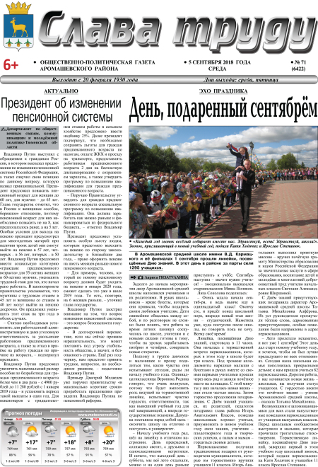 PDF-версия газеты «Слава труду» № 71 (6422) от 05.09.2018 г.