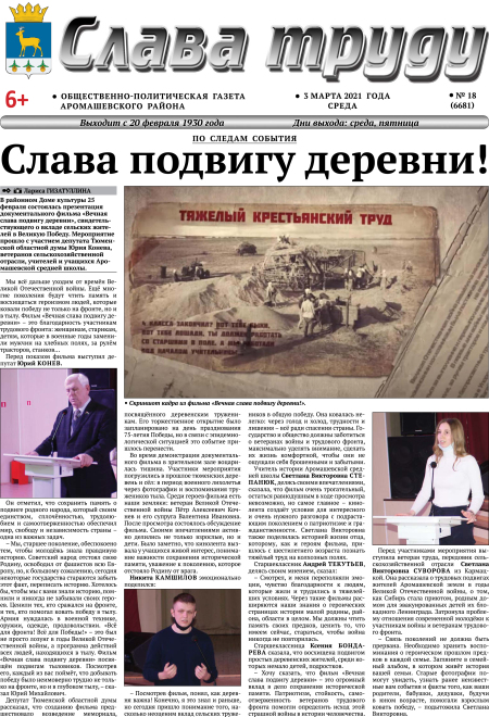 Уважаемые читатели! Предлагаем вам электронную версию газеты «Слава труду» № 18 от 03.03.2021 г. в формате PDF.