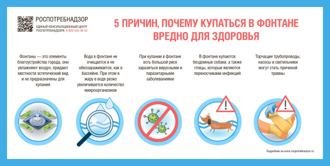 4. Развлечение в фонтане чревато не только простудой, но и более серьезными заболеваниями. Купание в фонтане может обернуться острой кишечной инфекцией, респираторной инфекцией, конъюнктивитами, главную же опасность представляют энтеровирусные, ротавирусные инфекции, вирусный гепатит А.