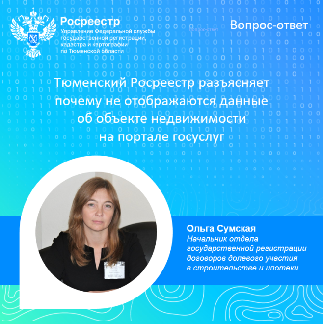 В рамках рубрики «Просто о важном» начальник отдела государственной регистрации долевого участия в строительстве и ипотеки Управления Росреестра по Тюменской области Ольга Сумская разъяснила почему в Личном кабинете портала государственных услуг не отображается информация о квартире, приобретенной по договору участия в долевом строительстве?