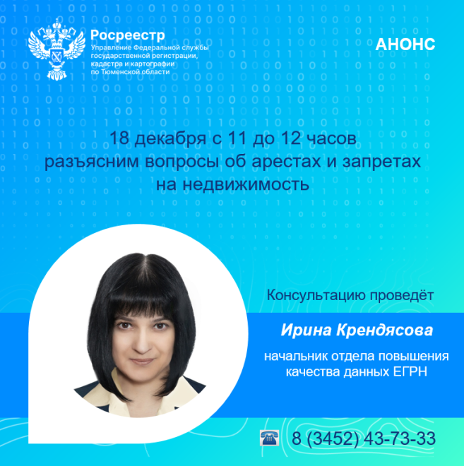 18 декабря начальник отдела повышения качества данных ЕГРН Ирина Крендясова разъяснит актуальные вопросы, связанные с наличием в ЕГРН обременения в виде ареста (запрета) на объекты недвижимости.