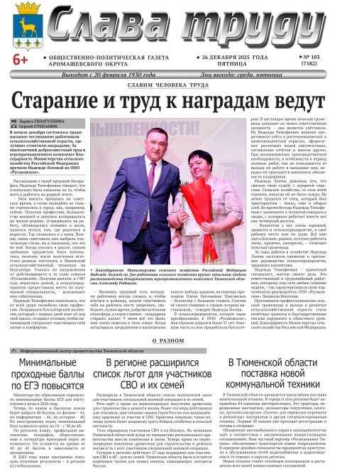Уважаемые читатели! Предлагаем вам электронную версию газеты «Слава труду» № 103 от 26.12.2025 г. в формате PDF.