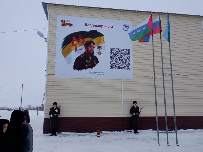 -- Дорогие студенты, уважаемые преподаватели, мы открываем баннер Владимиру Артёмовичу Жоге. Это уже традиция в округе. Во всех образовательных организациях прошла эта акция. Пришло время техникума. Акция посвящена героям, которые вокруг нас, героям, которые жили с нами, героям, которые защищали и защищают наше Отечество. Это те люди, для которых интересы нашего государства, благополучие и счастье других людей выше, чем свои собственные. Это люди, о которых мы должны помнить, это люди, у которых мы должны учиться быть человечными, трудолюбивыми, ответственными за данное дело. Ваша сегодня задача – хорошо учиться, так как герои не только рождаются на войне, но и в мирное время. Это мастера своего дела. Это учителя, это врачи, пожарные, сотрудники полиции и так далее. Все те, кто своим трудом создаёт благополучие для людей. Поэтому достигайте высоких результатов, живите ради своей семьи, ради своего государства, своей малой родины. Цените и уважайте своих героев. Желаю вам всем здоровья.