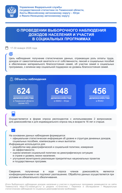 В период с 17 по 30 января 2026 года в Тюменской области проводится Выборочное наблюдение доходов населения и участия в социальных программах.