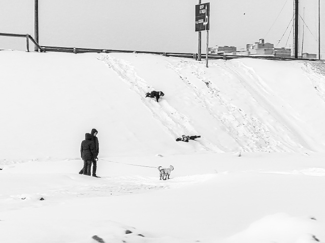 Наверное, детям кажется безопасным их импровизированное развлечение на склоне. Машины – отдельно, за отбойником. Внизу пятачок чистого (пока еще) снега. На дорогу не выкатишься, кажется, при всем желании. Но взрослому смотреть на это тревожно.