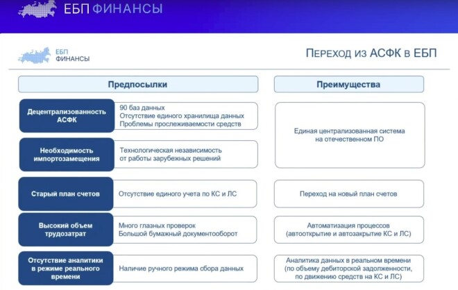 Для внедрения ЕБП была проведена ревизия бизнес-процессов. Новая платформа проектировалась в течение двух лет, прошла этапы опытной эксплуатации и в мае 2025 года была введена в постоянную эксплуатацию. Единая бюджетная платформа избавилась от устаревших процессов Автоматизированной системы Федерального казначейства (АСФК). Проведена оптимизация, автоматизация и применены технологические решения интеграции с бухгалтерскими программами. В целях импортозамещения АСФК, централизации данных, унификации плана счетов, снижения времени прохождения платежей и в перспективе перехода на проведение платежей в режиме 24/7, принято решение о миграции клиентов всех уровней на новую платформу в период с 2025 по 2028 год. На новую платформу переводят не только лицевые счета и бюджетные данные наших клиентов, но и сами казначейские счета, движение денежных потоков между казначейством и национальной платежной системой Банка России, поэтому ЕБП не только система казначейского обслуживания, но и часть системы казначейских платежей (СКП), где по сути Федеральное казначейство работает как банк в классическом его понимании. Для нашей области рано или поздно также предстоит миграция на новую платформу, поэтому рассмотрим новации, примененные в ЕБП для организаций: