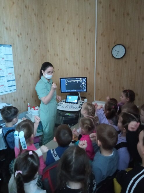 Кульминацией экскурсии стала демонстрация шейной вены каждого малыша и фото УЗИ этой вены на память. На мониторе появилось реалистичное изображение, врач показала, как выглядит вена изнутри, как пульсирует кровь в вене. Дети с удивлением рассматривали картинку, задавали вопросы и сравнивали аппарат с компьютером.