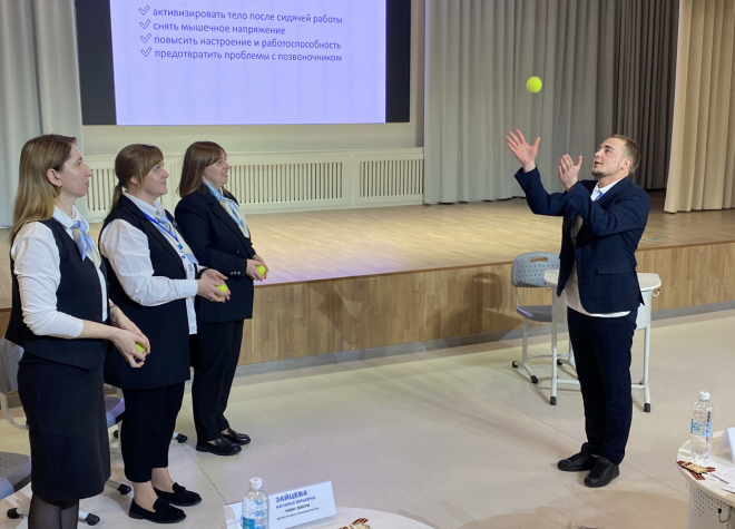 Дмитрий Кобзарь, учитель физкультуры Мальковской школы, свой мастер-класс назвал: "Сидячий образ жизни отправляем в нокаут". Он ведет предмет, который сам по себе предполагает двигательную активность. Но, по мнению педагога, некоторые упражнения могут быть использованы в качестве физкультминутки, небольшой разминки на других уроках или во время подготовки домашних заданий. В качестве спортивного оборудования для этих целей подойдут обычная пластиковая бутылка с водой или теннисный мячик. Как эти снаряды могут быть использованы, попробовали на себе не только педагоги, но и некоторые члены жюри. Эксперимент получился увлекательным.