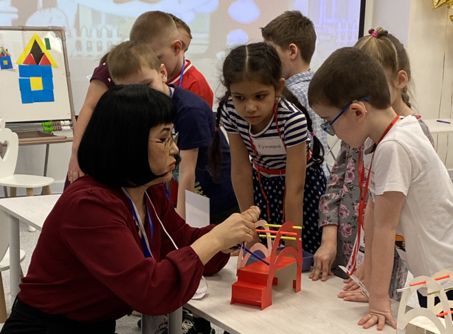 Выходить второй оказалось тоже непросто. Но большой опыт работы позволил Диане Портнягиной собраться, сконцентрироваться и как фигуристу на Олимпийских играх продемонстрировать без помарок свою яркую "обязательную программу". В ее занятии удивительно гармонично сочетались несколько элементов "ультра-си". Участнице удалось в легкой игровой форме познакомить 5-летних детей с такими сложными понятиями как перфокарта, конструкция, строение моста, сварочный аппарат. Дети, разделившись на группы, с энтузиазмом собирали геометрические фигуры по схемам. Они помогали друг другу, когда у кого-то возникали трудности, и вместе строили и украшали мосты "лампочками". Каждый этап работы отмечался мотивирующими оценками-кружочками. Занятие по знакомству с профессией сварщика оказалось одинаково увлекательным для мальчиков и девочек. Как и обещала воспитатель в начале урока, дети почувствовали себя "немного волшебниками". Все педагогические цели, включая расширение словарного запаса, развитие мелкой моторики, внимания и воображения, были достигнуты успешно.
