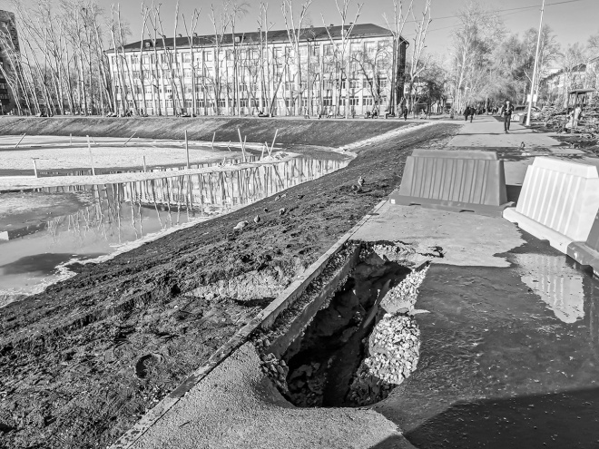 Утром в среду в управе Ленинского округа мне сообщили, что восстановлением провала занимается подрядчик, который в прошлом году благоустраивал территорию вокруг пруда. Я снова приехала на пруд и действительно застала там трех рабочих, которые подтвердили, что они представители подрядчика. Течь была устранена, но яма по-прежнему зияла. Сель, вытекший из-под дорожки, образовал в воде твердую площадку в несколько метров в диаметре, по которой прогуливались радостные голуби и чайки.