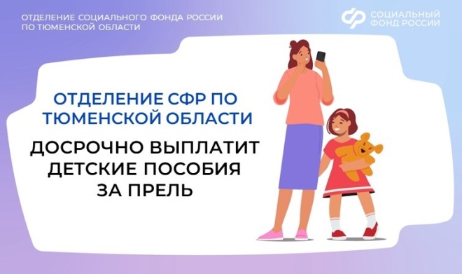В связи с приближающимися майскими праздниками Отделение Социального фонда России по Тюменской области перечислит детские пособия за апрель досрочно — 29 апреля. Перенос даты выплат коснётся родителей, получающих выплаты на банковскую карту или счёт.