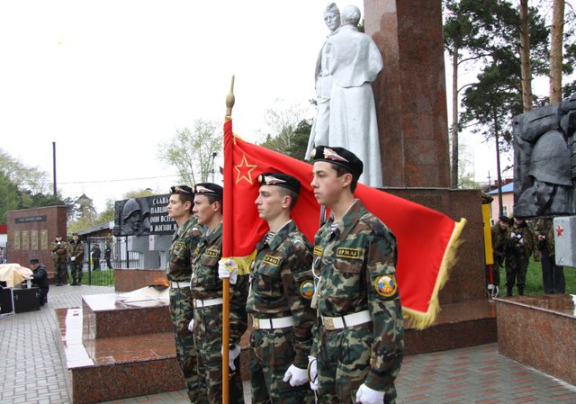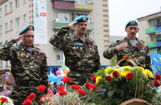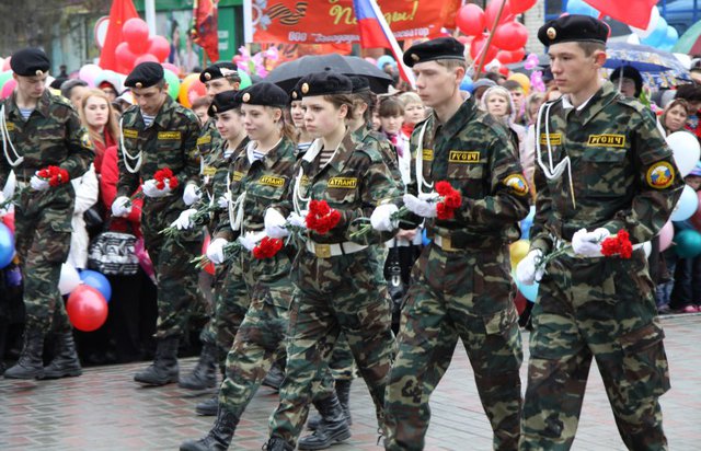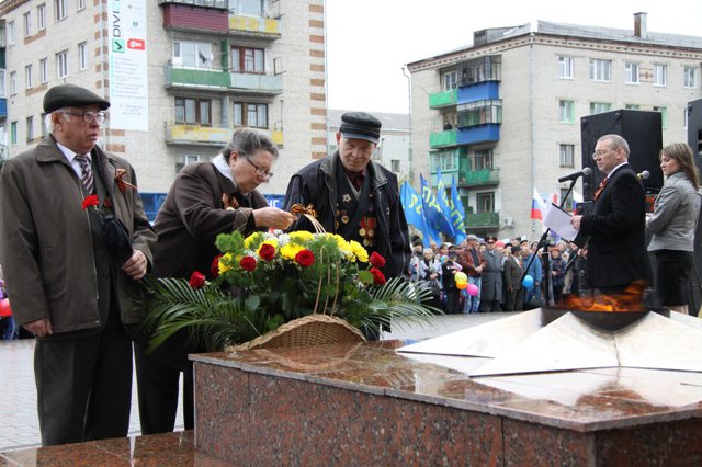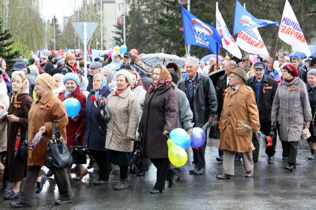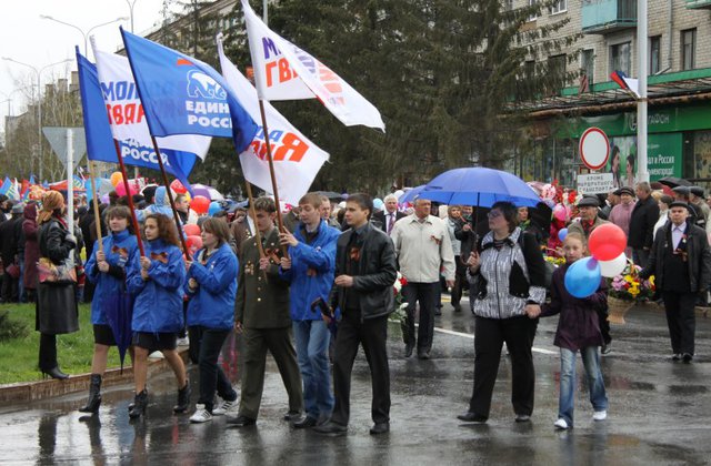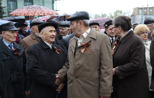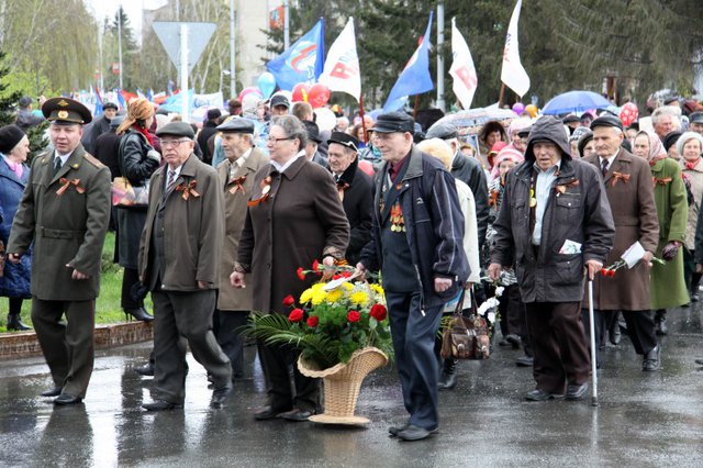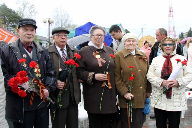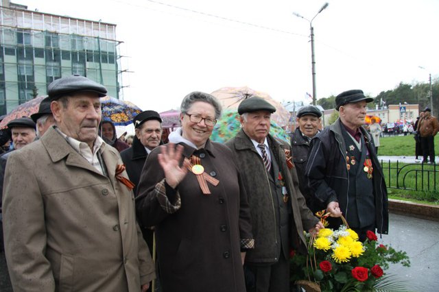 Утро 9 мая выдалось ветреным и дождливым. Но погода не испугала ветеранов: закалённые морально и физически, они возглавили торжественное шествие по главной улице города.